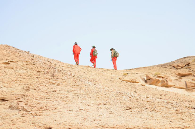 新疆鑫匯公司的野馬泉西金礦項(xiàng)目工作區(qū)距離哈密市155公里,工期為6-10月,需完成6千米的鉆探工作任務(wù)、16平方公里的地質(zhì)剖面等。礦區(qū)內(nèi)山丘連綿不絕,自7月開始,每天下午礦區(qū)地面溫度均超過普通溫度計(jì)的最高刻度,屬于“爆表”狀態(tài)。因工作任務(wù)緊,地質(zhì)隊(duì)員們每天早上7點(diǎn)出發(fā),中午之前要返回基地,傍晚重新出發(fā),22點(diǎn)前趕回基地,開展剖面測(cè)量和鉆探編錄工作,以避開正午的酷熱。為了不被灼傷,地質(zhì)隊(duì)員和鉆探工人把自己包裹得嚴(yán)嚴(yán)實(shí)實(shí),手拎地質(zhì)錘敲下每一個(gè)礦化線索,身背樣品包裝載好沉甸甸的希望。汗水浸濕衣衫,腳底磨出老繭,他們踏遍了礦區(qū)的角角落落,最終繪制出整個(gè)礦區(qū)的礦化藍(lán)圖。