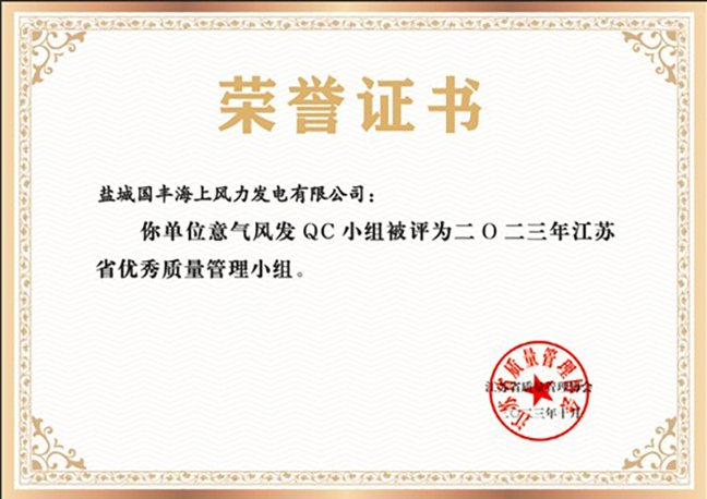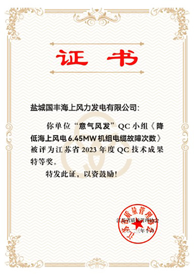 日前,從江蘇省質(zhì)量管理協(xié)會(huì)傳來(lái)喜訊,鹽城國(guó)豐公司《降低海上風(fēng)電6.45MW 機(jī)組電纜故障次數(shù)》質(zhì)量管理成果榮獲江蘇省2023年度QC技術(shù)成果特等獎(jiǎng),同時(shí),公司QC小組被評(píng)為2023年江蘇省優(yōu)秀質(zhì)量管理小組。