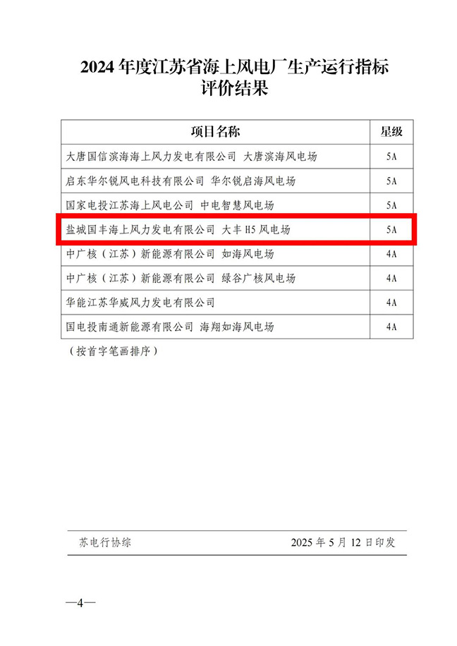 在鹽城綿延的海岸線上,鹽城國豐海上風(fēng)力發(fā)電有限公司運維團(tuán)隊以專業(yè)與堅守,推動鹽城國投集團(tuán)海上風(fēng)電業(yè)務(wù)穩(wěn)步發(fā)展。2024年2月鹽城國能大豐H5項目單月發(fā)電量達(dá)8118萬度,創(chuàng)江蘇省海上風(fēng)電單月發(fā)電量最高紀(jì)錄,11月實現(xiàn)機(jī)組可利用率達(dá)100%。2025年,該公司憑借卓越的全周期運維管理能力和高度協(xié)同的團(tuán)隊協(xié)作精神,獲評“江蘇省AAAAA級海上風(fēng)電場〞稱號。